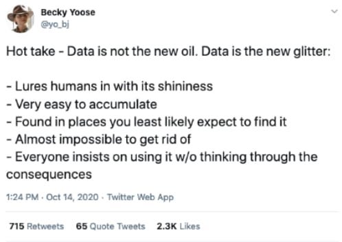 The goal of business is to sell stuff. The more you buy, the more the company tries to sell you. The more you refer other people, the more the company rewards you. This perpetual cycle continues to find more people like you. So over time, data has become an increasingly invaluable asset. Today, it’s everywhere. The more people put themselves online — their conversations, their behaviors, instrumenting their bodies, their cars, their homes — the more people like me love it!