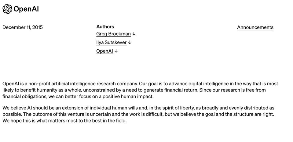 On OpenAI’s blog dated December 11, 2015, this announcement appeared: