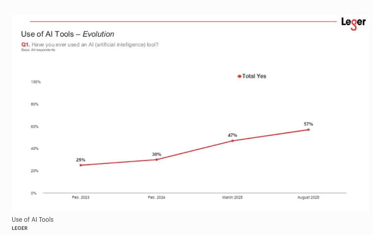 This study, which covers Canadians across provinces, by gender and across three age groups (18-34, 35-54 and 55+) reveals that use of AI tools has gained momentum from 25% in February 2023 to 57% in August 2025. A marked increase to 47% in March of 2025 from a year prior leads us to believe, as McLeod Macey cautions, these findings are still early day. “Usage is concentrated among younger adults and so far, there is trust and comfort (86% user satisfaction) among them,” she explains.