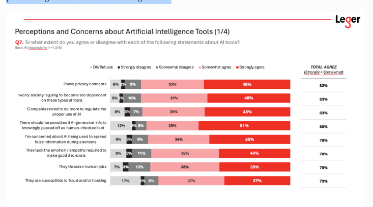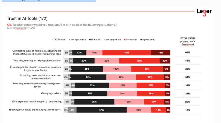 Jennifer McLeod Macey is Senior Vice President at Leger, which independently released this report on AI usage in Canada. She expresses, “We believe it’s essential to contribute to the news landscape while also understanding public sentiment on a broad range of issues. In this study, we’ve been tracking certain trends for some time — for example, usage, which has been rising steadily and has shown a sharp increase over the last five months. With this report, our goal is to go further by examining aspects such as trust, concerns, and fears surrounding these developments.”